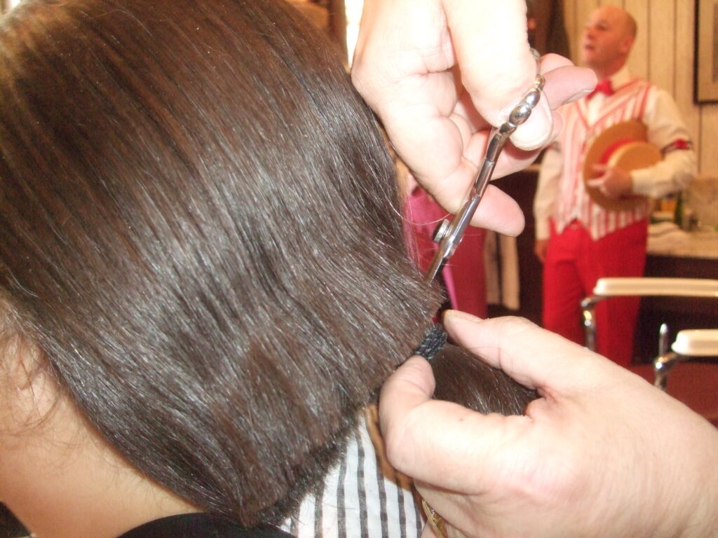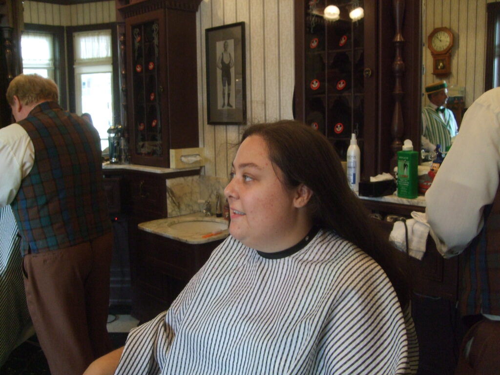 My hair was finally long enough to donate last July and I came up with a brilliant idea that I would commemorate the occasion by getting my hair cut in the Magic Kingdom at the Harmony Barber Shop on Main Street. This is something that I’d wanted to do for years, but the timing was never right. Adult haircuts cost $19 just for a cut, no washing or drying. When I went in, I told the Cast Members what I was doing and that I was donating my hair. They said they are used to it and do cuts for that purpose several times a week. In fact, they had already done one that morning already.